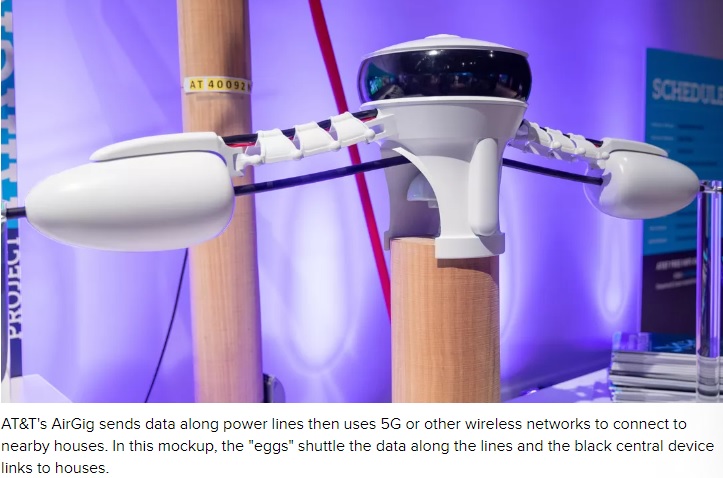 AT&T hopes its AirGig technology for piggybacking high-speed data links on power lines will arrive in 2021, potentially improving broadband in areas where it’s not economical to lay fiber-optic cables.